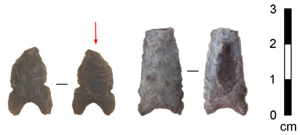 Two-sided views of arrow points recovered from the body of the individual in Burial 28544 in the Alameda-Stone Cemetery: in left femur (left), in cranium (right). Note the massive impact fracture on the left point (red arrow), where the force of the arrow striking bone chipped a large flake from one face of the point (photo by R. J. Sliva).