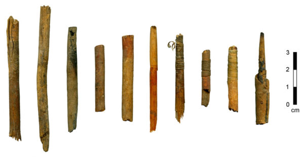 Historic-era arrow foreshaft fragments from a collection donated to Desert Archaeology. These are lightweight pieces of wood with diameters about half that of a standard yellow pencil. Sinew bindings, used to secure the arrow point into the split or slotted end of the foreshaft, are still present on the 2nd-4th pieces from the right. The rightmost foreshaft still has a sharpened wooden tip in place, with black resin used to adhesive still visible. Some of the foreshafts are painted (photo by R. J. Sliva).