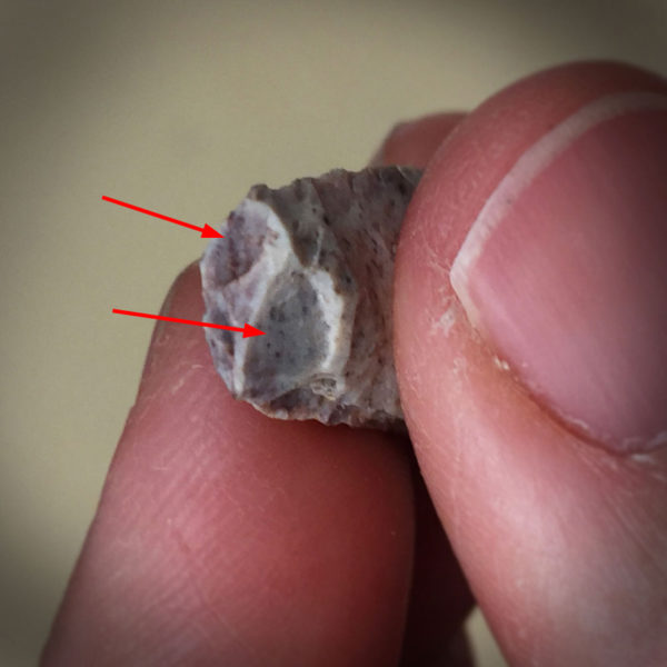 Closeup of the shattered tip of the point in the Burial 28544 individual’s cranium, with the ends of impact fractures visible (red arrows) (photo by R. J. Sliva).