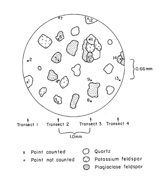 In this illustration, Points 1, 3, 11, and 12 symbolize quartz grains, Points 5, 6, and 10 plagioclase feldspar, and Point 14 a potassium feldspar. Points 10 and 11 both land on a sand-sized piece of granite composed of quartz, potassium feldspar, and plagioclase feldspar. Using traditional point-counting conventions that piece of sand would be recorded as granite. However, using the Gazzi-Dickinson method point 10 would be recorded as plagioclase feldspar and point 11 as quartz. Points 1, 3, 5, 6, 12 and 14 represent granitic constituent minerals already decomposed from the parent rock. Points 2, 4, 7, 8, 9, and 13 did not land on any sand-sized material, but, in a pottery thin section, would be counted as clay paste.
