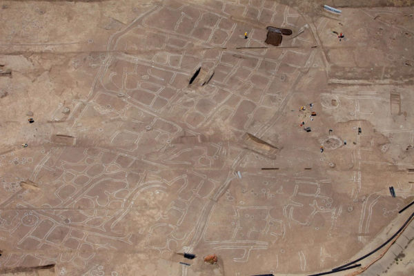 An aerial photograph of one of the field areas showing the uncovered field cells and the ditches used to bring water into them. Archaeologists outlined the ditches and bunds white paint to make these features more visible in photographs. Workers appear as tiny figures in orange vests and white hard hats in the right portion of the frame (photo by Henry Wallace)