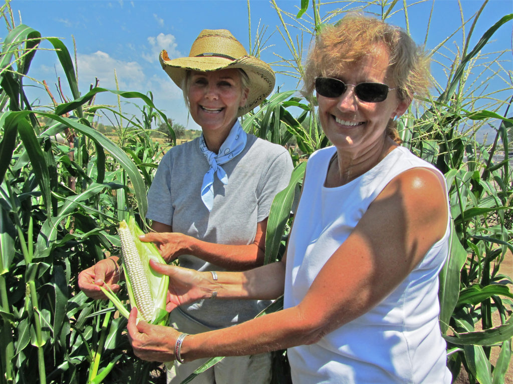 Joyce Rychener (left) and Jenny Adams (right) harvesting immature popcorn for grinding.