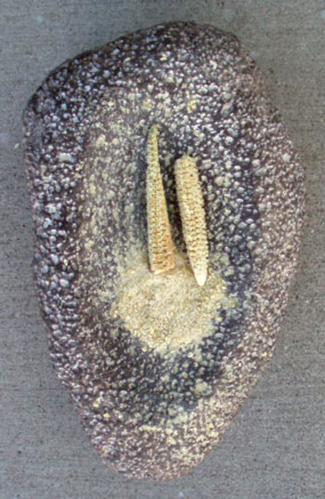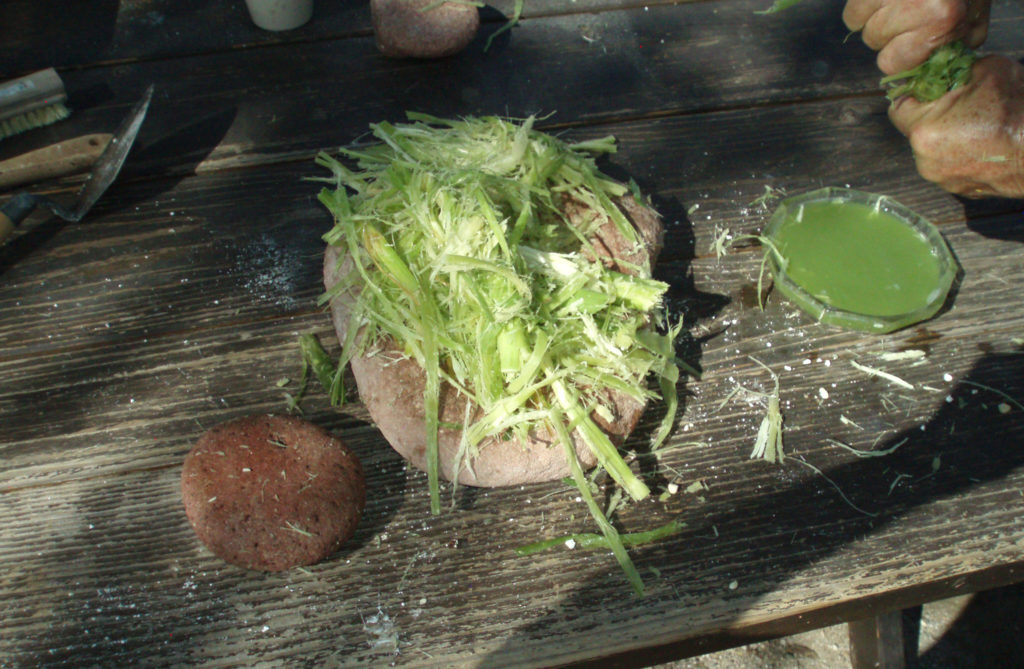 Immature corn stalks are piled in a metate where they were pounded with a round mano (lower left) before being squeezed to extract sweet green juice (upper right).