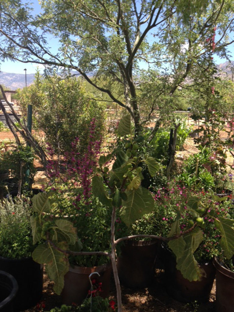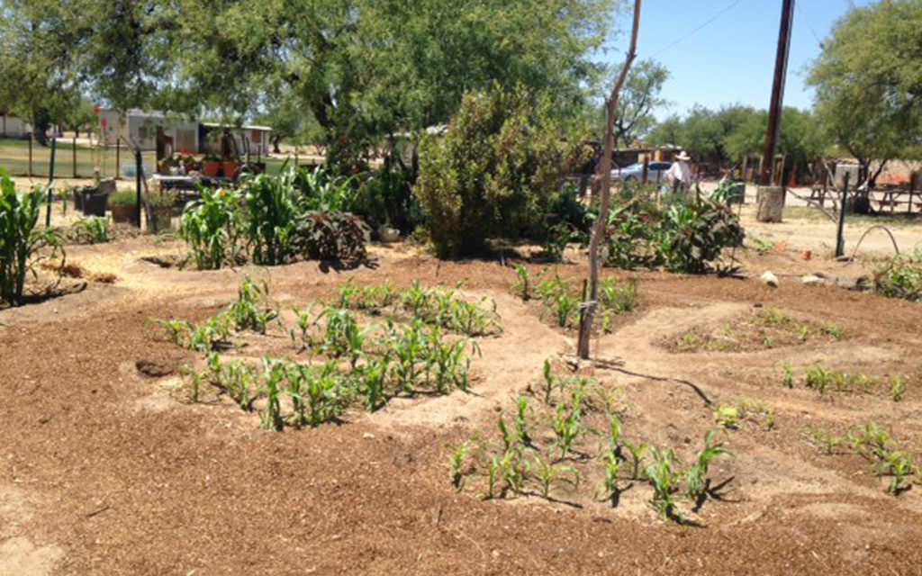 A line of mature mesquite trees provide shade near the garden, and other flowers planted between the trees and the garden help attract bees and other pollinators to the garden plants.