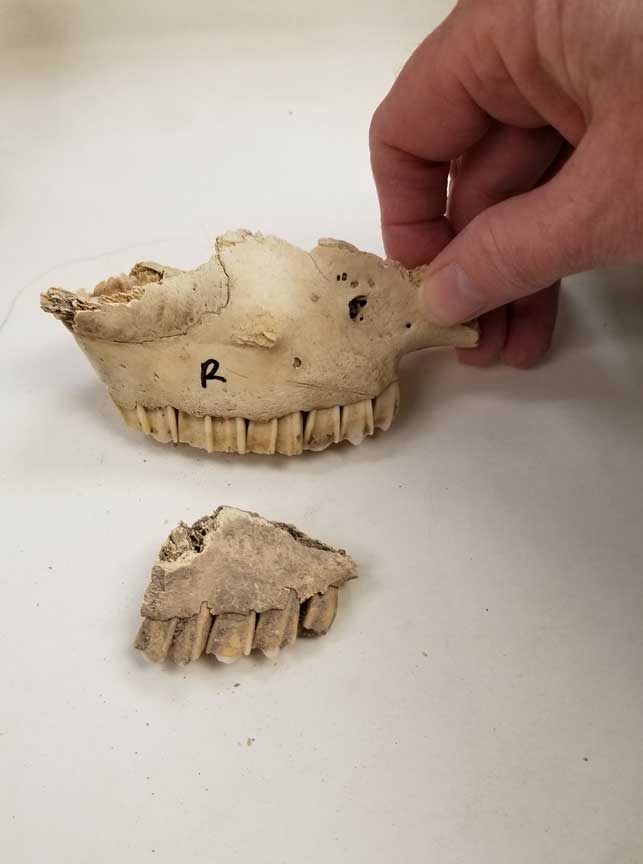 Desert Archaeology has a comparative collection of commonly found species. Here, Jenny identifies a fragment of a maxilla from the Presidio dig by comparing it to a right sheep maxilla.