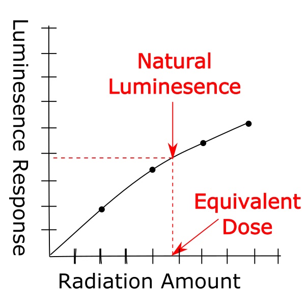 First, the reader stimulates the quartz sample with light, energizing the trapped electrons. The electrons escape and the quartz luminesces. The machine records this signal, which is casually called the natural luminescence, and it represents the total radiation the sample received during burial. The machine then performs several cycles where it exposes the sample to radiation, stimulates it with light, and measures the luminescence response. It changes the radiation amount with each cycle. It finally produces a graph that tracks the sample's luminescence response to a range of radiation levels. The equivalent dose is at the point on the graph that matches the natural luminescence signal. Now that the equivalent dose and the dose rate are known, a date for the quartz sediment can be calculated.
