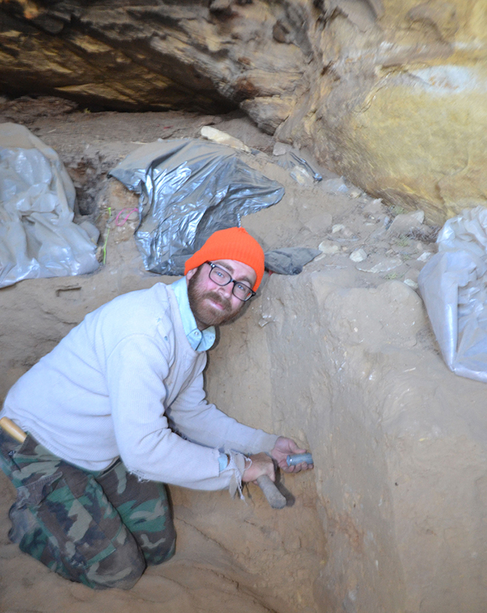 Caleb Ferbrache collecting OSL samples from a rockshelter in Montana. Here he is pounding a tube into the sediment for the equivalent dose sample.