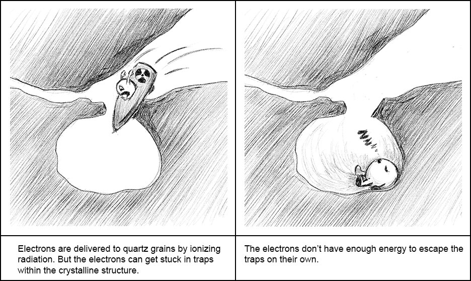 The most relevant thing to know about quartz is that it is full of traps. These traps are defects in the crystal that will capture electrons. These electrons will remain trapped until exposed to an energy source, such as light or heat, which will allow the electron to escape. As the electron escapes the trap, it also releases some light. OSL gets its name because quartz is stimulated with light, and it luminesces as electrons escape.