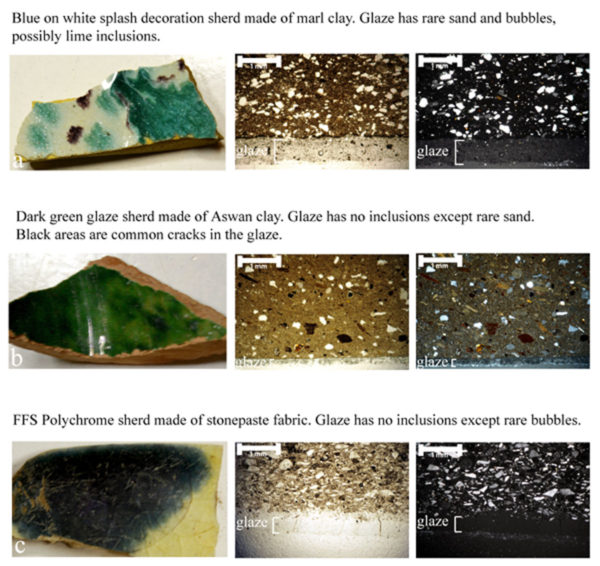 Different Egyptian glaze wares with microscopic images of the glazes.
