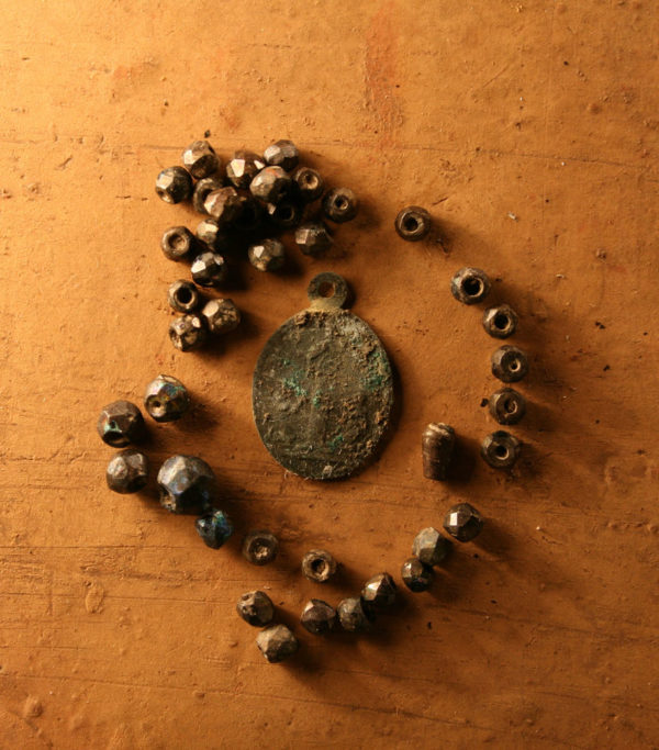 A "Corazon de Jesus y Maria" medal and 44 glass beads (photo by Robert Ciaccio).