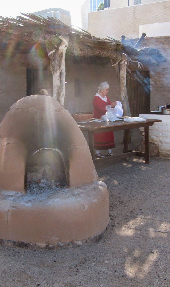 Hornos (bread ovens) were scattered about outside and probably used communally. O'odham cooking vessels were used to made soups and stews, heated by being placed on a trivet of rocks over a small pit where firewood burned. Larger barbeque pits could also be used to roast large pieces of beef.