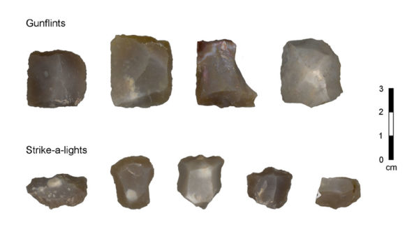 At the time, gunflints were manufactured in large quantities in France. As it became more difficult to obtain these, soldiers turned to local stone. They may have asked Native Americans to help flake the stone. As the gunflints wore out, they were repurposed as strike-a-lights, used to create sparks to make fires.