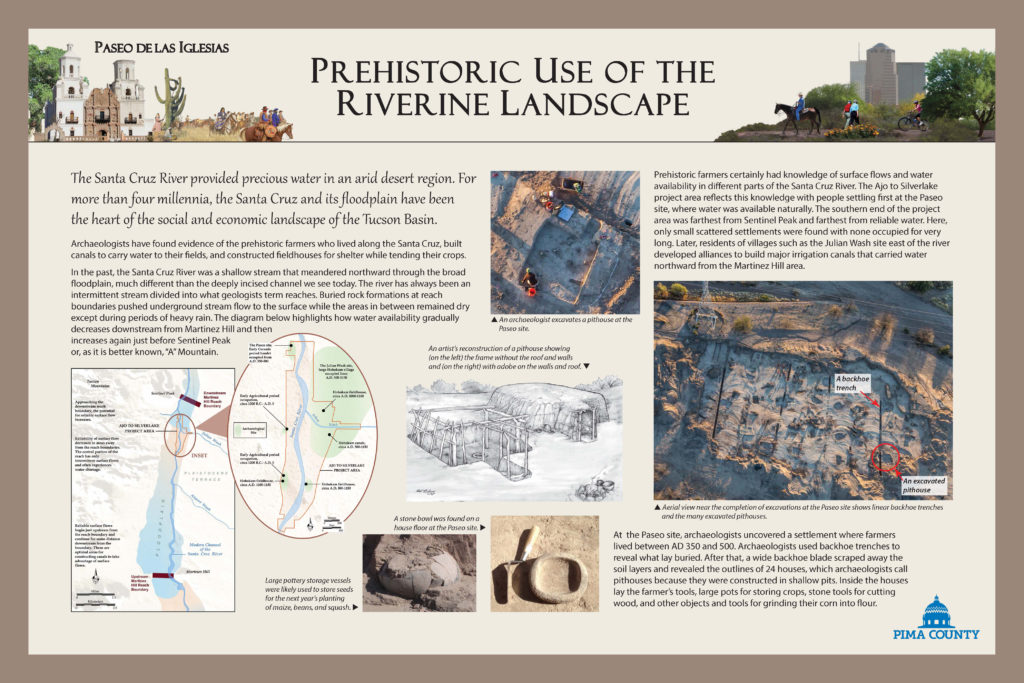 Another two signs were created for the Paseo de Las Iglesias trail, located on the west side of the Santa Cruz River south of West Silverlake Road. One focuses on the prehistoric site found there, while the other examines the historic period use of the area, which included a grain mill, a resort, and a brewery.