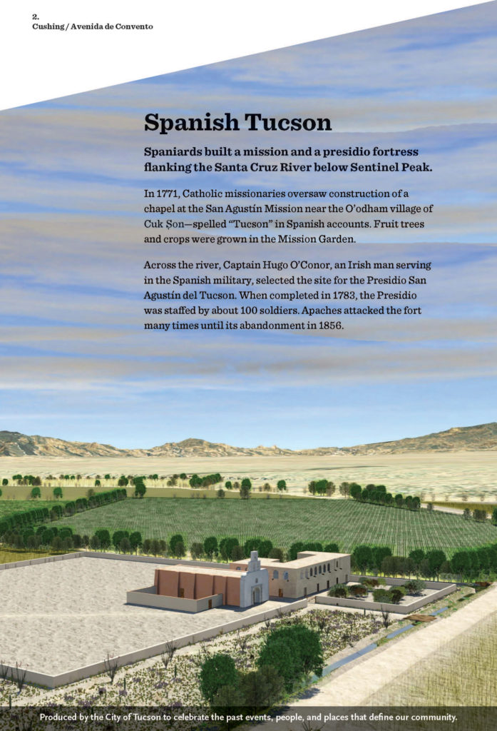 Desert's Homer Thiel and Trish Castalia collaborated with outside consultants to produce several signs highlighting Tucson history for Sun Link streetcar stops throughout downtown, 4th Avenue, and the University district. This one can be found at the Cushing/Avenida de Convento stop west of downtown.