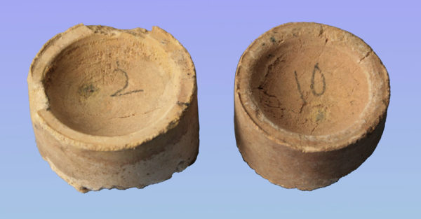 Cupels are made from bone ash pressed into a mold. They were used to extract silver and gold from other metals, and through careful weighing the amount contained in a sample could be determined. Sample numbers, written in pencil, were visible on many (photo by Robert Ciaccio).