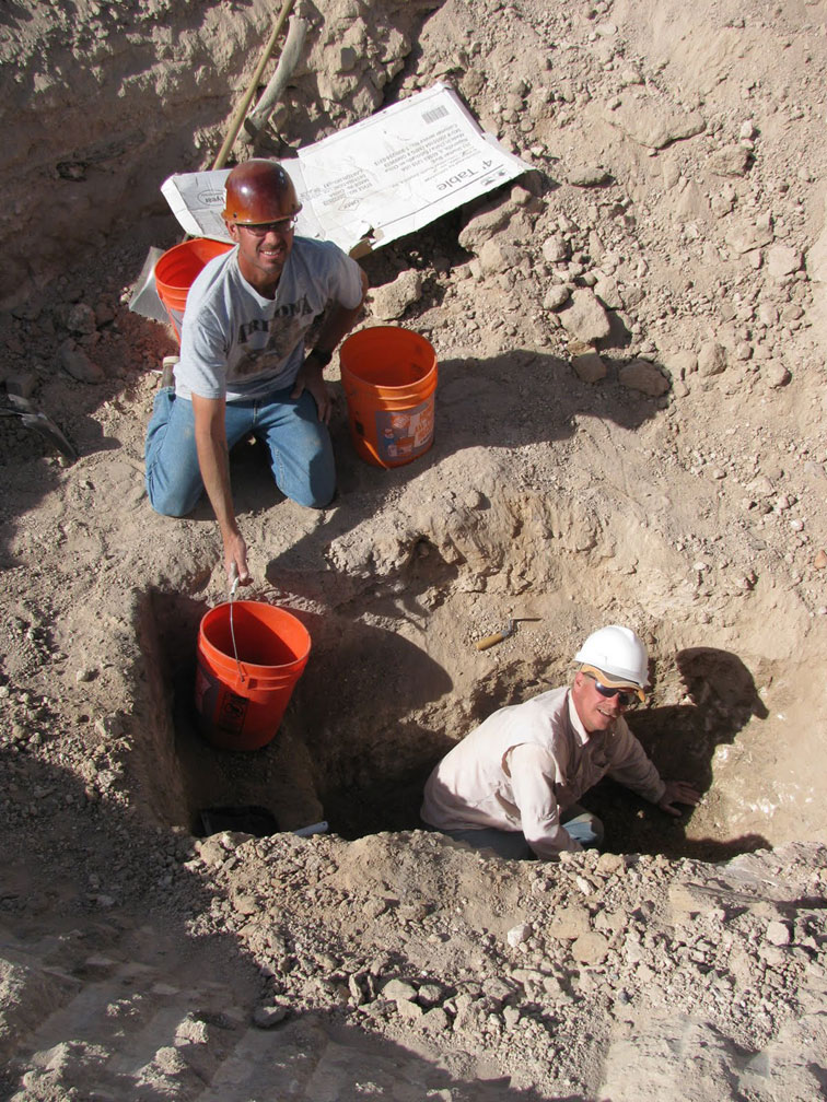 Wores lived in an adobe house on the property, and we found a pair of outhouse pits associated with Wores’s occupation. One was 1.75 m deep and yielded a decorated O’odham olla, a Mexican ceramic duck, tin cans, and cupels.