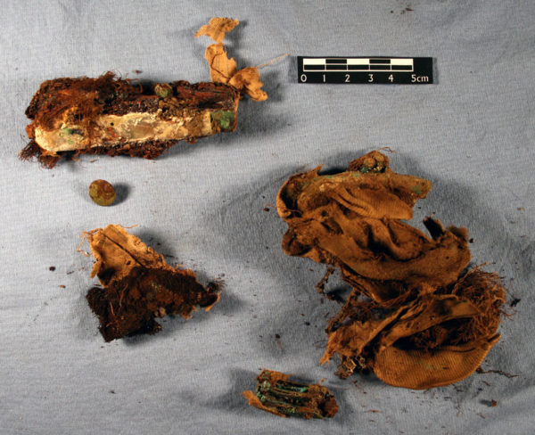 At the foot end of the coffin lay over two dozen buttons, apparently from as many as four different pieces of clothing.