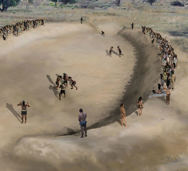 Artist’s reconstruction of a game in progress in a ball court near Tucson. Illustration by Rob Ciaccio.