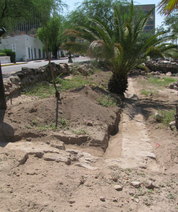 In 2012, private citizens raised money for a small pocket park, Christopher Franklin Carroll Centennial Park to commemorate Arizona’s 100th birthday and a local resident. The park is located on a small strip of undeveloped City of Tucson land downtown at the southwest corner of N. Main Avenue and W. Washington Street. Before construction took place, Desert Archaeology excavated a pair of backhoe trenches at the north and south end of the planned park, finding soil layers with artifacts and a Presidio-era soil mining pit. We also dug three 1x2 meter excavation units. Two came down onto a rock foundation, which we subsequently uncovered.
