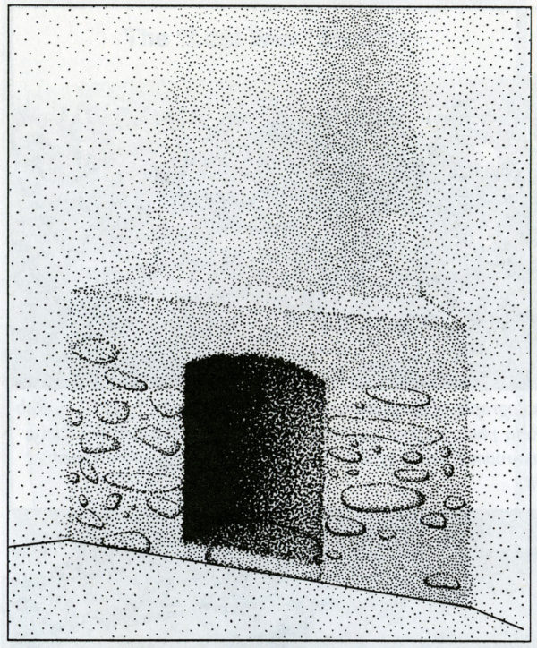 A corner fireplace was found in the excavated room. Archaeologists observed very little fire-blackening on the stones, another clue that the occupation was short-lived. Because rocks remained in place only to the level of the fireplace opening, the shape of the chimney above is conjectural.