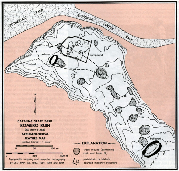 Catalina State Park was established in 1983. Located in the western Catalina foothills north of Tucson and east of the town of Oro Valley, the park has both natural and cultural resources. Desert Archaeology conducted a survey of the park to document archaeological sites, including the Romero Ruin. This multi-component site includes Hohokam trash mounds, a compound with structures, and two ballcourts.