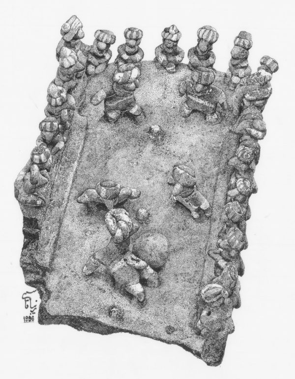 Historic accounts from the first Spanish incursions into Mexico relate games played with rubber balls in courts similar to those found in southern Arizona. Rubber balls have been found in southern Arizona as well. This drawing illustrates a game depicted on a prehistoric ceramic piece from Nayarit, Mexico. Illustration by Ziba Ghessemi.