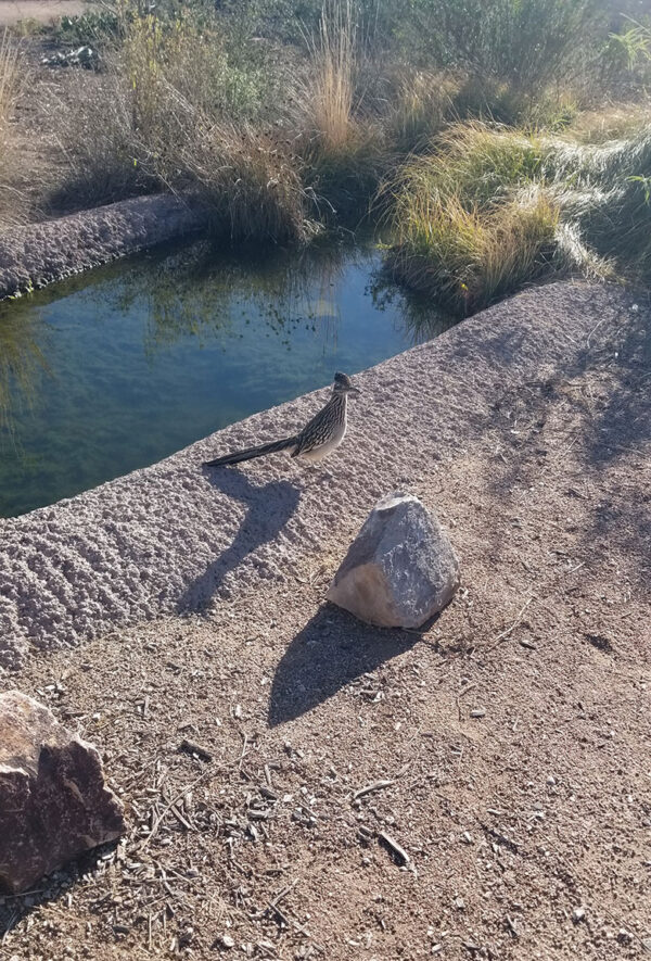 A roadrunner visiting the Mission Garden acequia (photo by Homer Thiel).