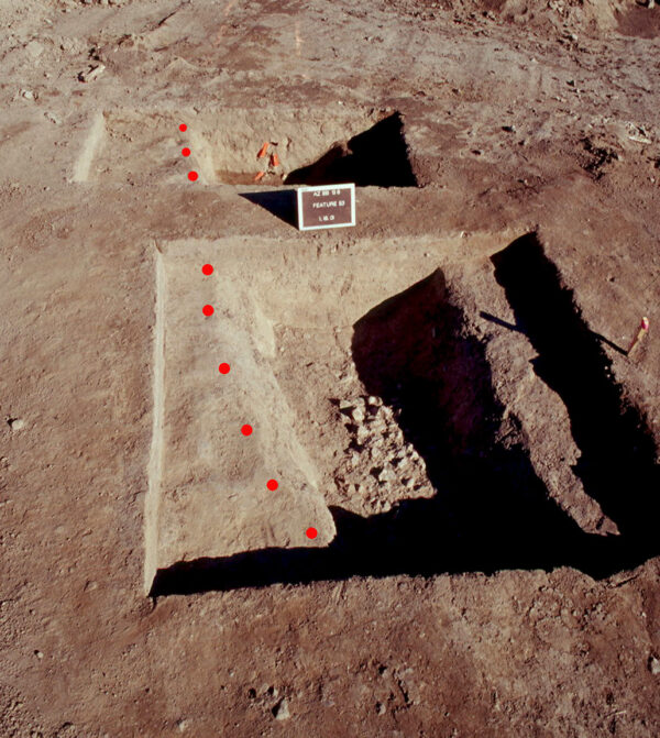 Scattered among the canals are solitary pit structures, which archaeologists call field houses. These may have been temporary residences for the people tending fields. In the mid-1950s, National Park Service archaeologist George Cattanach observed large quantities of Hohokam pottery to the south and east of Mission Garden, suggesting a large village had been present there. Unfortunately, the area was subsequently destroyed by the city of Tucson for a landfill. During Desert Archaeology’s work in Mission Garden, we found remnants of Hohokam houses—mostly hearths that were deep enough to survive historic period plowing.