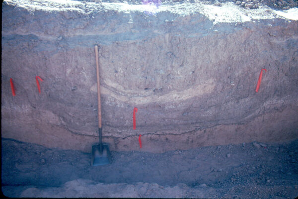 A profile of a large Hohokam canal. The base is stained with manganese, which develops as water seeps through the base of the canal. The visible layers are sediments that were deposited as the canal was used and during floods (photo by Desert Archaeology).