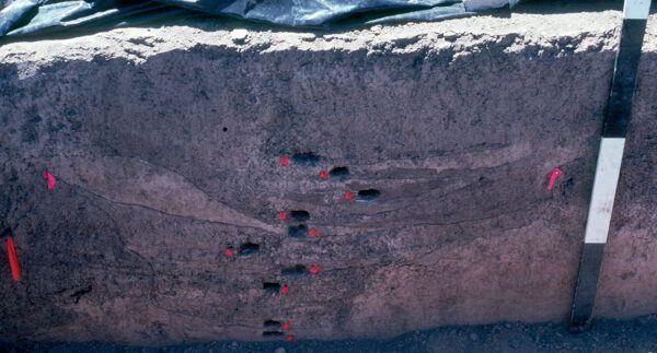 An Early Agricultural period canal at the Mission Locus of the Clearwater site. It was lined with fire-cracked rocks, perhaps in an effort to stop erosion. The red dots indicate the left edge of the canal, running from bottom to top in the frame. (photo by Desert Archaeology)